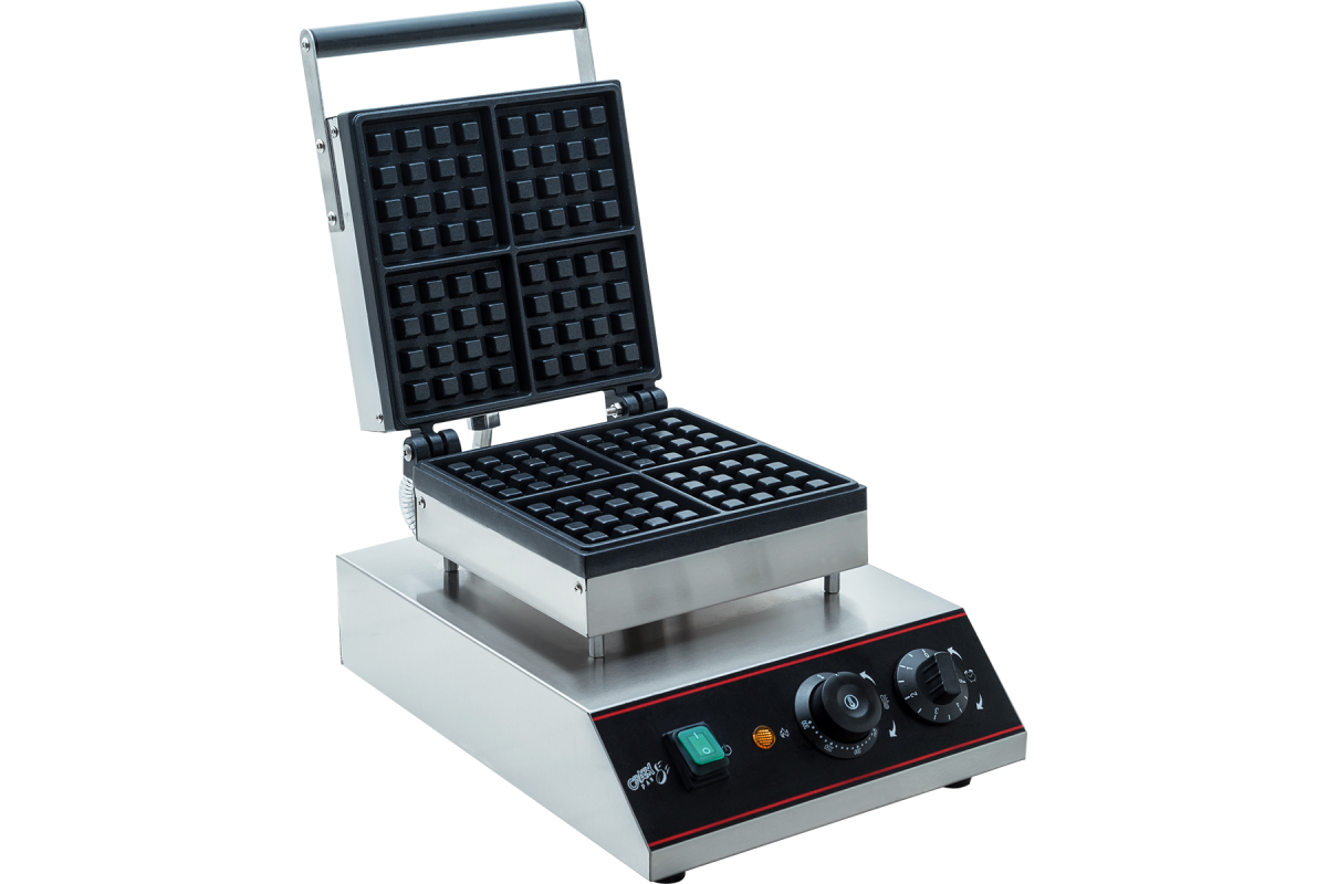 - 4 прямоугольные секции — одновременное приготовление 4 вафель за один цикл. Это увеличивает производительность, что критически важно в часы пик, и позволяет быстро выполнять крупные заказы.