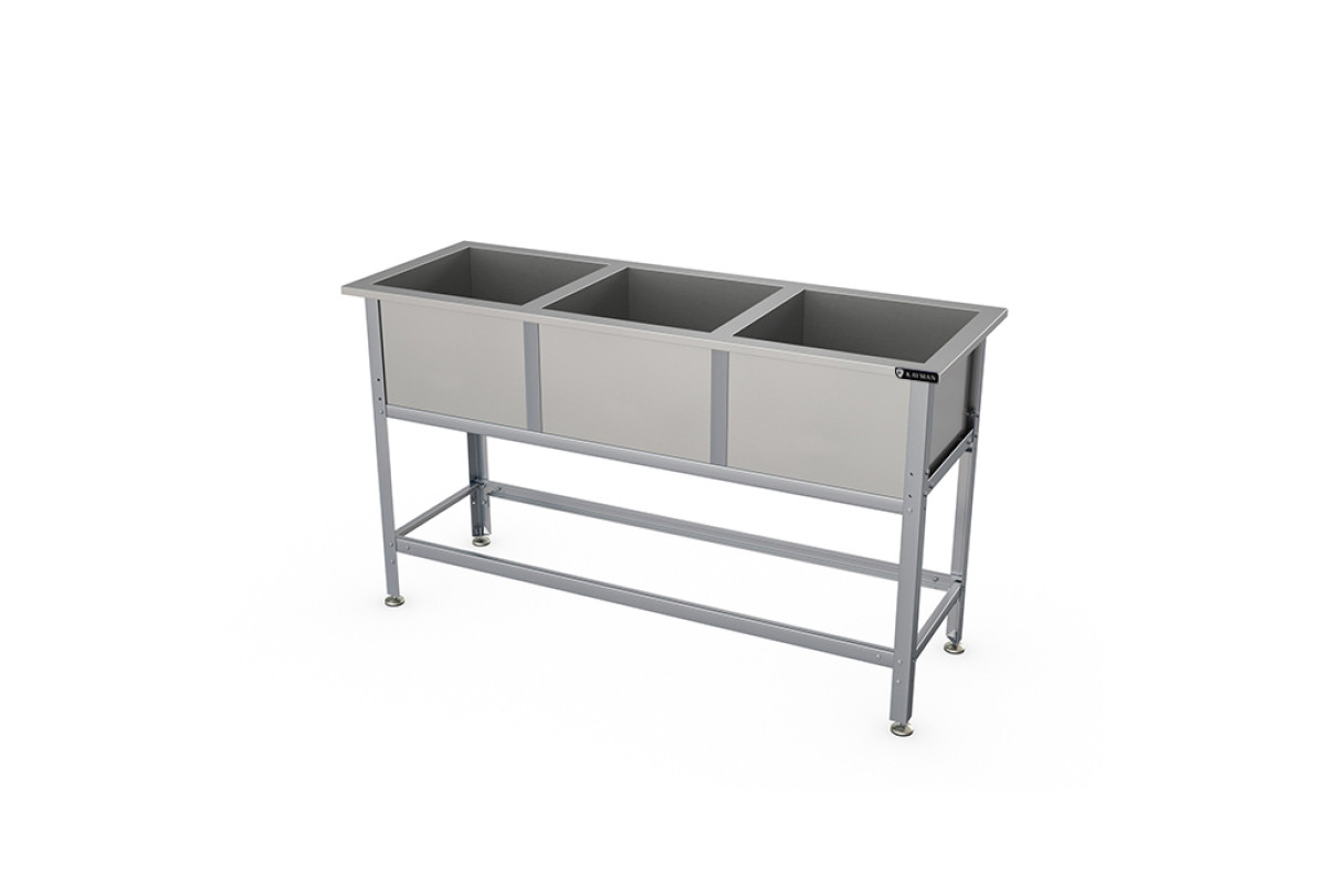 Габариты 1790х630х870мм, внутренние размеры ванны 530х530х400мм, сварная, 3 секции, ширина бортов по периметру ванны 50мм, диаметр сливного отверстия 48мм, нет отверстия под смеситель, ванна AISI430 0,8мм, каркас 1,2мм оцинкованная сталь, профиль уголок 40х40мм, регулировка ножек 20мм.Все кромки ванны и элементов каркаса имеют подгиб (фальцовку). В комплект поставки ванны НЕ входит система разрыва струи.