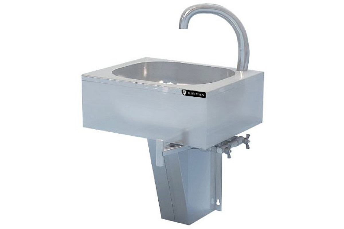 Габариты 500х500х600мм, габариты мойки 400х500х120мм, диаметр сливного отверстия 48мм, высота пристенного борта 20мм, отверстие под смеситель, материал рукомойника AISI 430 0,8мм, имеет борт с пристенной стороны и смеситель, вес 10,2мм. Подача воды осуществляется с помощью поворотного механизма для регулирования напора воды, который расположен под раковиной. Механизм может приводиться в действие бедром работника, обеспечивая быструю подачу воды. В комплект поставки входит крепеж для стены, сливным сифоном с гидрозатвором.Рукомойник размещается на стене с подключением к водопроводной сети и канализации. Смеситель в комплект не входит.