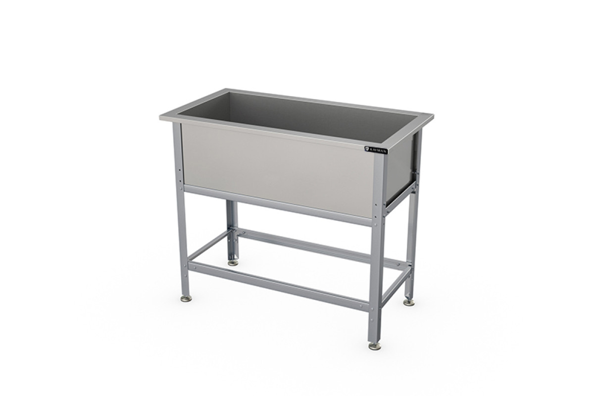 Габариты 1210х630х870мм, внутренние размеры ванны 1010х530х400мм, сварная, 1 секция, ширина бортов по периметру ванны 50мм, диаметр сливного отверстия 48мм, ванна AISI304, каркас 0,8мм AISI 430, профиль уголок 40х40мм, регулировка ножек 20мм.Все кромки ванны и элементов каркаса имеют подгиб (фальцовку). В комплект поставки ванны входит система разрыва струи.