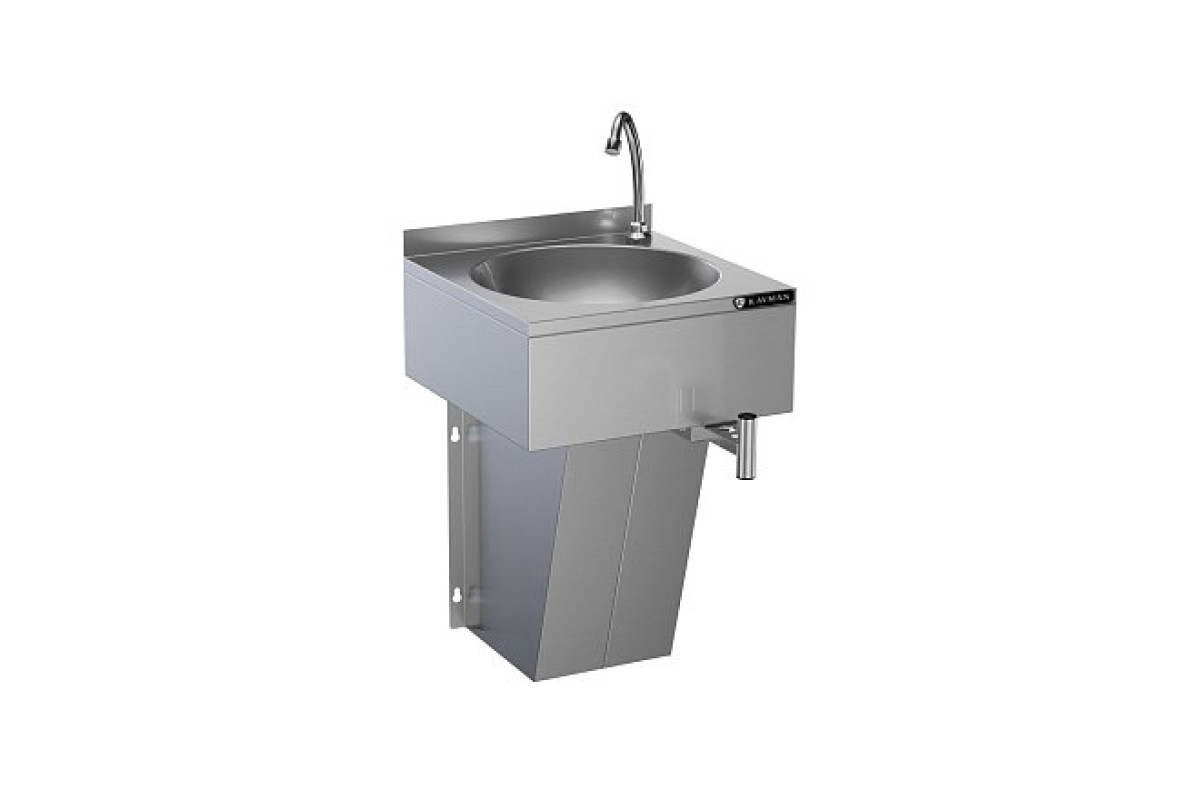 Габариты 400х500х615мм, габариты мойки 400х400х120мм, диаметр сливного отверстия 48мм, высота пристенного борта 20мм, отверстие под смеситель, материал рукомойника AISI 430 0,8мм, вес 10,5мм. Подача воды осуществляется с помощью поворотного механизма для регулирования напора воды, который расположен под раковиной. Механизм может приводиться в действие бедром работника, обеспечивая быструю подачу воды. В комплект поставки входит крепеж для стены, сливным сифоном с гидрозатвором.Рукомойник размещается на стене с подключением к водопроводной сети и канализации. Смеситель в комплект не входит.