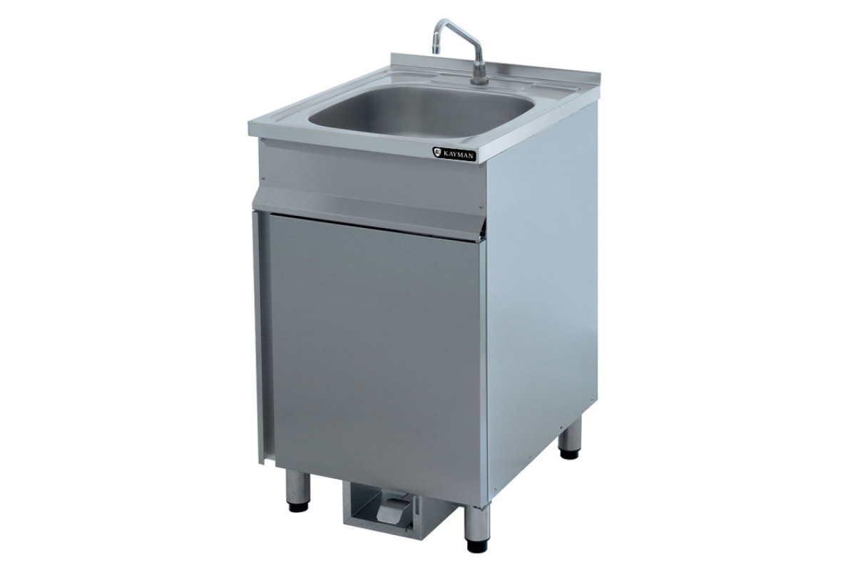 Габариты 500х600х870мм, габариты ванны цельнотянутой 400х400х150мм, диаметр сливного отверстия 48мм, высота пристенного борта 20мм, отверстие под смеситель, материал ванны AISI 304 0,5мм, материал ванны AISI 304 0,5мм, корпус AISI 304 0,8мм, регулируемые ножки 20мм диаметром 50мм, вес 26мм. Ванна установлена на тумбу, боковые стенки и передняя распашная дверца из AISI 430. Задняя стенка выполнена из оцинкованной стали толщиной 1,2 мм и имеет два отверстия для подвода водопроводных шлангов. Имеет педаль , при нажатии на которую из установленного на ванну носика поступает вода. Регулировка температуры воды осуществляется с помощью кранов, расположенных внутри тумбы. Смеситель в комплект поставки не входит. Ванна укомплектована сливным сифоном с гидрозатвором.