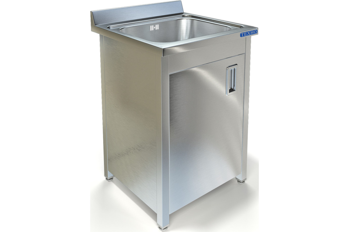 600х600х850мм, Одна цельнотянутая емкость размером 500х400х250 из нержавеющей стали марки AISI 304 толщиной 1мм, обнижение 15 мм. Объемный пристенный борт высотой 70мм. Корпус из трубы 40х40 нержавеющей стали марки AISI 430 толщиной 1,2мм.и боковых панелей из нержавеющей стали марки AISI 430 толщиной 0,8мм. Одна распашная дверь, полка. Ванна комплектуется выпуском с нержавеющей решеткой и механическим запорным клапаном, диаметр выпуска 90мм, диаметр подключаемого сифона 50мм, перелив, регулируемые опоры. На дно ванны нанесена виброшумоизоляция. Ванна поставляется в собранном виде.