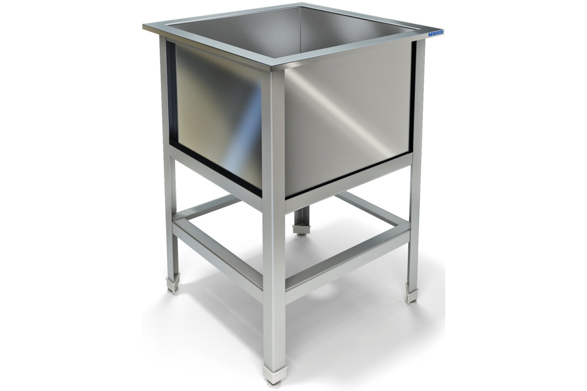700х700х850мм, Одна сварная емкость размером 600х600х450 из нержавеющей стали марки AISI 304 толщиной 0,8мм. Каркас сварной из уголка 40х40 нержавеющей стали марки AISI 304 толщиной 2мм, внизу по периметру обвязка. Ванна комплектуется выпуском с нержавеющей решеткой и механическим запорным клапаном, диаметр выпуска 90мм, диаметр подключаемого сифона 50мм, регулируемые опоры. На дне ванны ребра (лучи) для жесткости и снижения вибрации. Ванна поставляется в собранном виде.