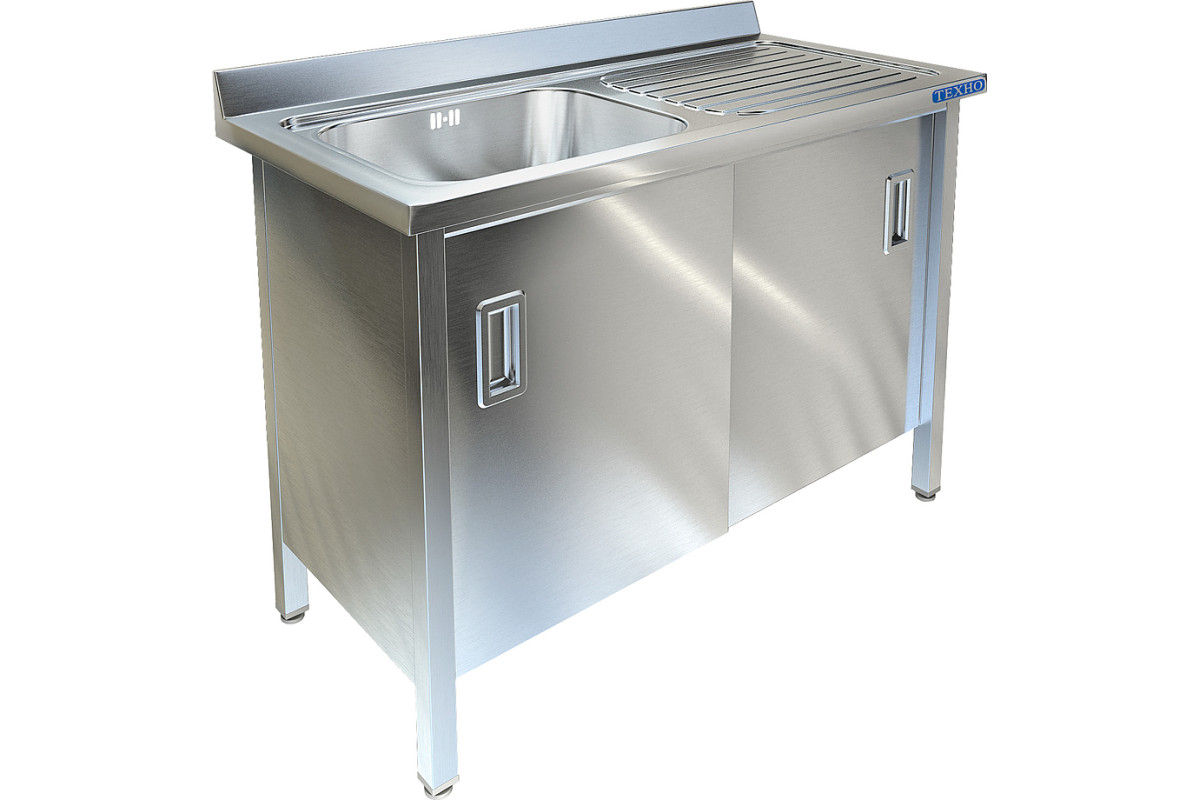 1200х600х850мм, Одна цельнотянутая емкость размером 500х400х250 из нержавеющей стали марки AISI 304 толщиной 1мм, ванна слева, обнижение 15мм, крыло рифленое с сушкой и наклоном для стекания воды с посуды в ванну. Объемный пристенный борт высотой 70мм. Корпус сварной из нержавеющей стали марки AISI 304 толщиной 0,8мм. Двери-купе, полка. Ванна комплектуется выпуском с нержавеющей решеткой и механическим запорным клапаном, диаметр выпуска 90мм, диаметр подключаемого сифона 50мм, перелив, регулируемые опоры. На дно ванны нанесена виброшумоизоляция. Ванна поставляется в собранном виде.