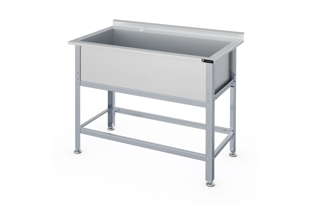 Габариты 1350х750х870 мм, внутренние размеры ванны 1250х600х450 мм, сварная, 1 ванна с бортом, ширина бортов по периметру ванны 50мм, диаметр сливного отверстия 48мм, ширина пристенного борта 100мм, высота пристенного борта 50мм, ванна AISI430 0,8мм, каркас 1,2мм оцинкованная сталь, профиль уголок 40х40мм, регулировка ножек 20мм.Все кромки ванны и элементов каркаса имеют подгиб (фальцовку). В комплект поставки ванны НЕ входит система разрыва струи.
