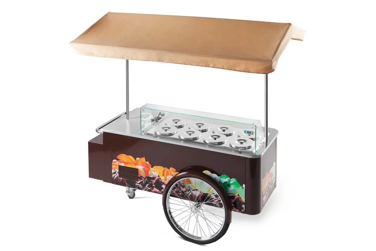 2000х1285х2081мм, 0,69 кВт, 220В, -16...-14C, На колесах, для уличной торговли и в помещениях. Вместимость 8 цилиндрических емкостей CARAPINA D200x250H по 7 л - заказываются отдельно, R290. Подсветка - LED5700K. Корпус коричневый, тент бежевый.