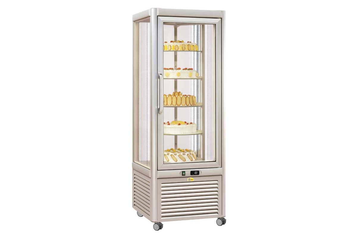 680x690x1820 мм, 220В, 0,52 кВт, темп. +4...+10С, 400л, круг. вращающиеся полки - 5 шт., диам 465 мм. в комплекте, на колесах. Цвет COD. 02 (светлая слоновая кость).