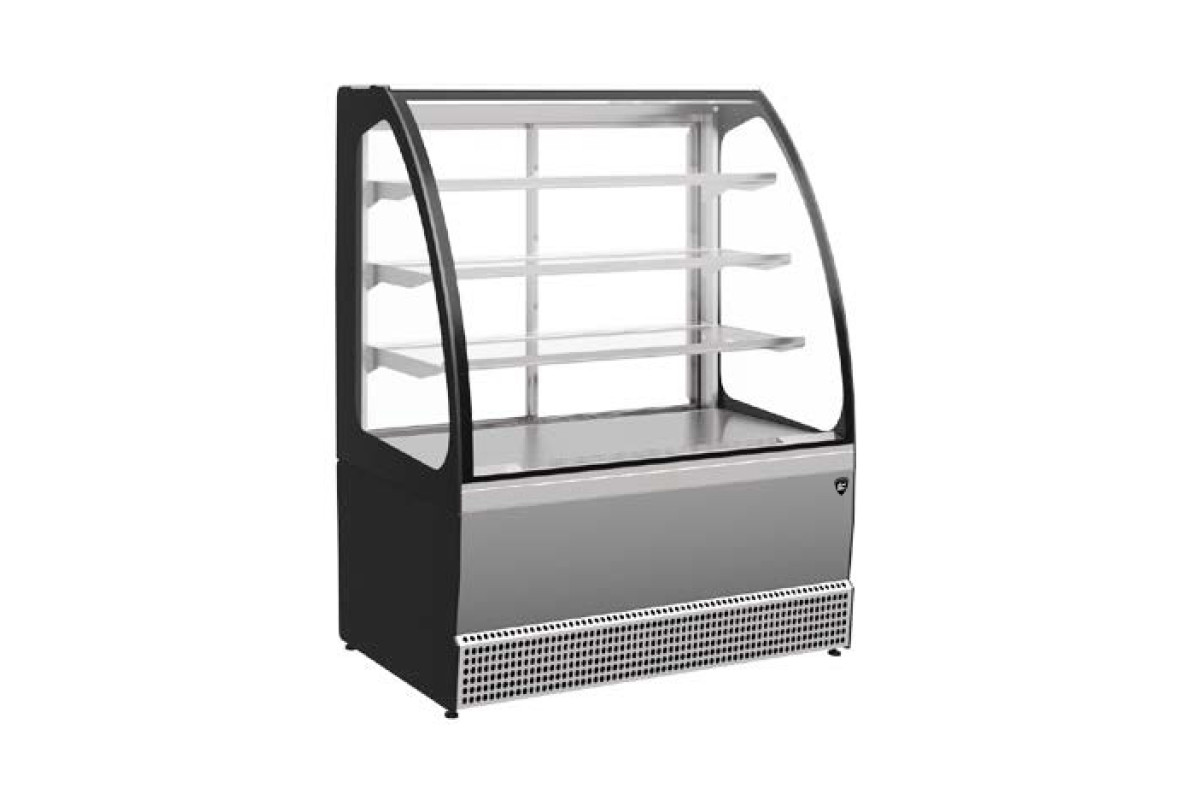 950х740х1265 t режим 0…+7 C. Витрина холодильная,со встроенным агрегатом, гнутое стекло, 3 стеклянные полки, полезный объем —0,25 м3,охлаждаемая площадь поддонов для выкладки продуктов, 1,3м2, динамическое охлаждение, раздвижные задние шторки, оттайка естественными теплопритоками, потр. эл.энергии в сутки —8,8кВт, R290, цвет корпуса — серый матовый