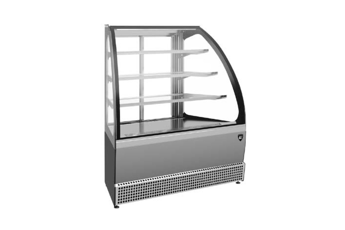 1200х685х1265 t режим 0…+7 C. Витрина холодильная,со встроенным агрегатом, гнутое стекло, 3 стеклянные полки, полезный объем —0,22 м3, охлаждаемая площадь поддонов для выкладки продуктов, 1,14 м2, динамическое охлаждение, раздвижные задние шторки, оттайка естественными теплопритоками, потр. эл.энергии в сутки —8,8 кВт, R290, цвет корпуса — черный