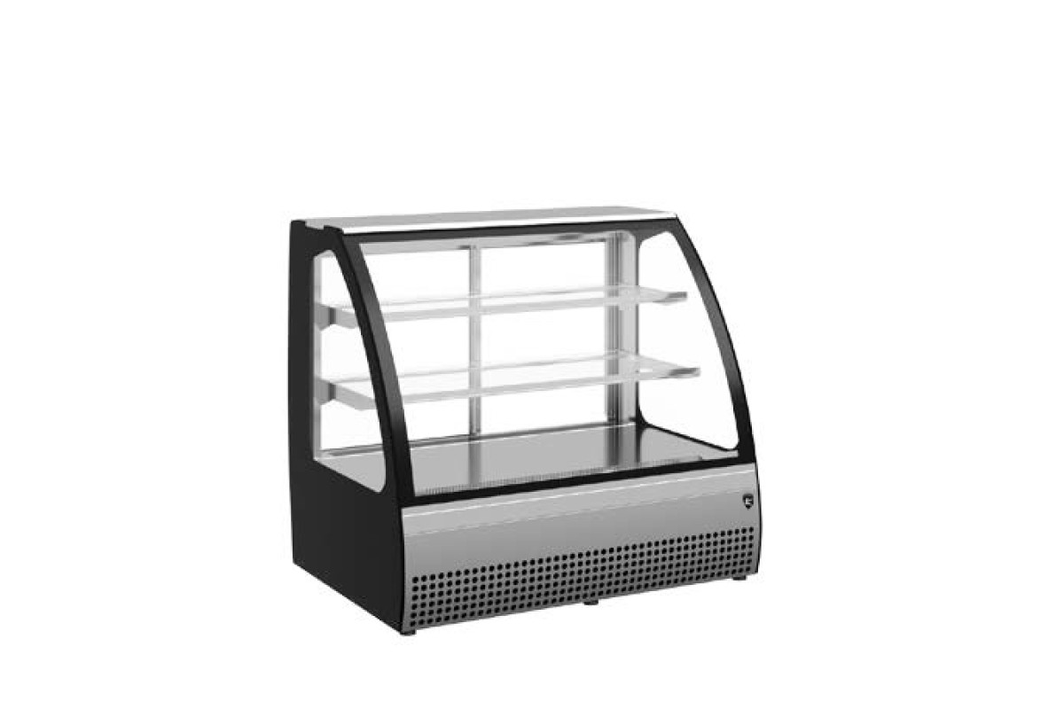 950х730х875 t режим +1…+10 C. Витрина холодильная,со встроенным агрегатом, гнутое стекло, 2 стеклянные полки, полезный объем —0,18 м3,охлаждаемая площадь поддонов для выкладки продуктов, 0,95 м2, динамическое охлаждение, раздвижные задние шторки, оттайка естественными теплопритоками, потр. эл.энергии в сутки —3,1 кВт, R290, цвет корпуса — черный
