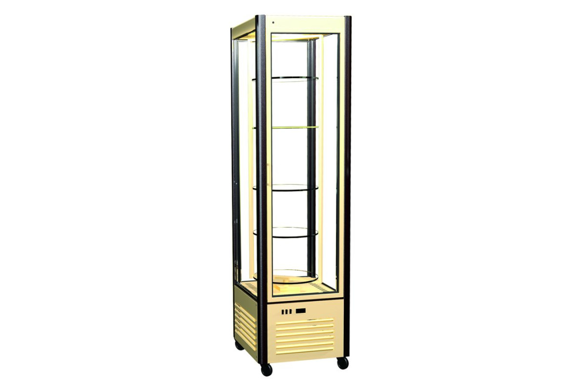 Витрина кондитерская вертикальная D4 VM 400-2 (бежево-корич) используется на предприятиях общественного питания и торговли для демонстрации, охлаждения и кратковременного хранения тортов, пирожных и других кондитерских изделий. Модель оснащена 4-х сторонним остеклением, стенки и двери - стеклопакеты (120 - дверь стекло 5мм). Микропроцессорный блок управления с индикацией температуры. 4 полки d-450 мм. Подсветка LED. Регулируемые колеса.