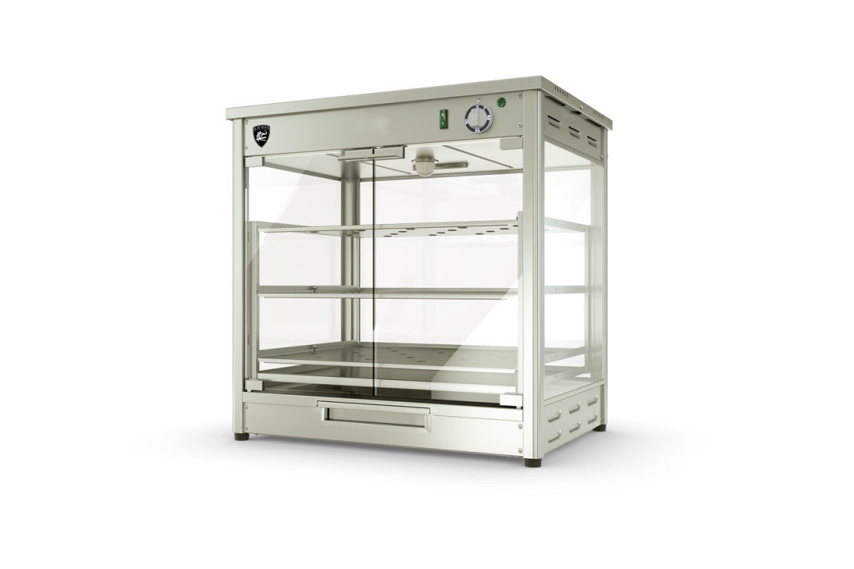 Заказ от 5шт.640х460х640мм,1,2кВт, 220В, +30…+85С, объем емкости для воды 1,5л, кол-во полок 3шт. На одну полку помещается 3 тушки (весом до 1200 граммов каждая). Полная загрузка витрины 9 кур. Каркас витрины и полки для выкладки изготовлены из пищевой нержавеющей стали AISI430.